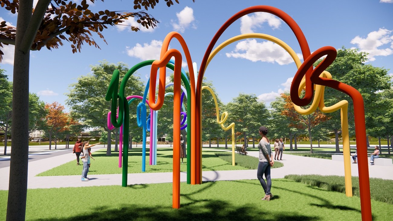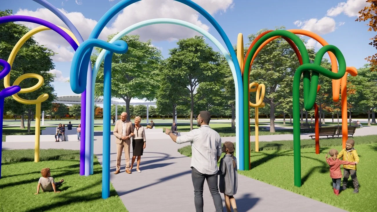 Common Roots is inspired by nature, migration, and community at Salt Lake City’s Pioneer Park. Positioned at the park’s north east entrance, the arches of the artwork spell out “Pioneer Park” in cursive. The colorful forms evoke both tree roots and migration routes, symbolizing the diverse communities and plant life that have shaped the park and its surroundings.